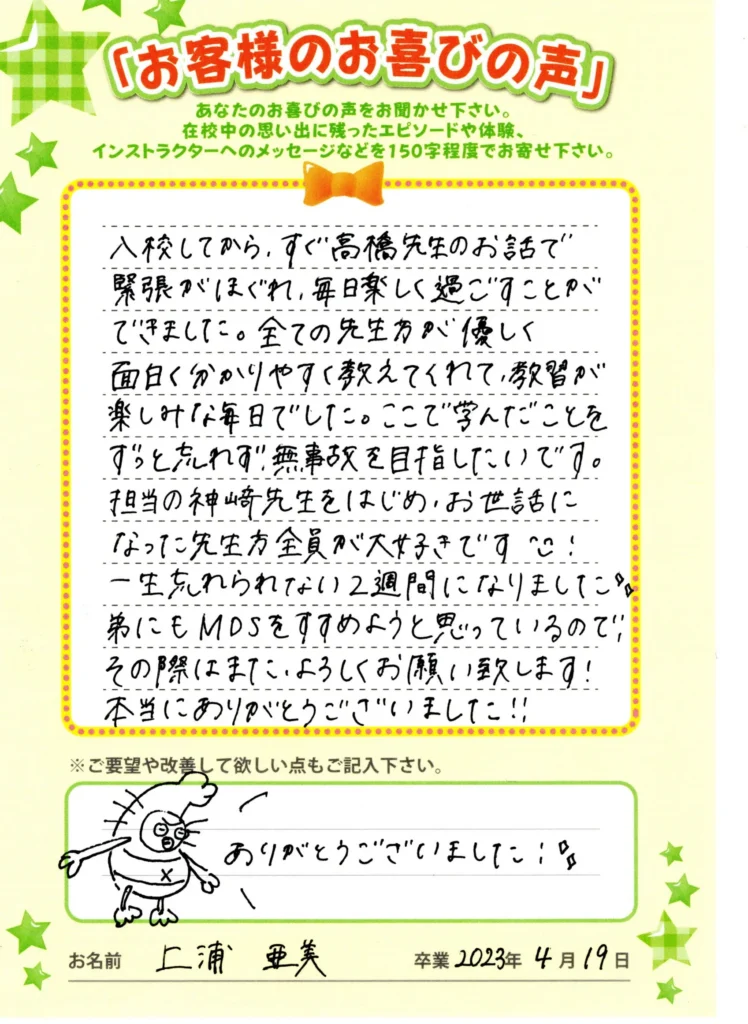 自動車学校お客様喜びの声を頂きました。