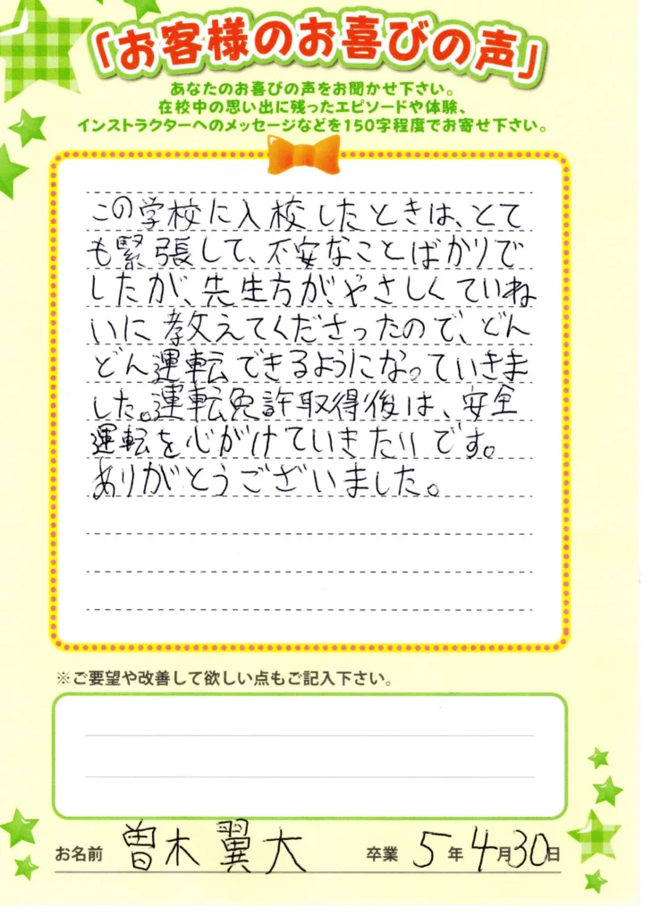 自動車学校お客様喜びの声を頂きました。