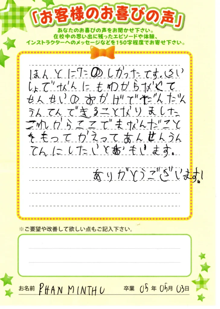 5月3日卒業のPHAN MINYHUさまより喜びの声を頂きました!