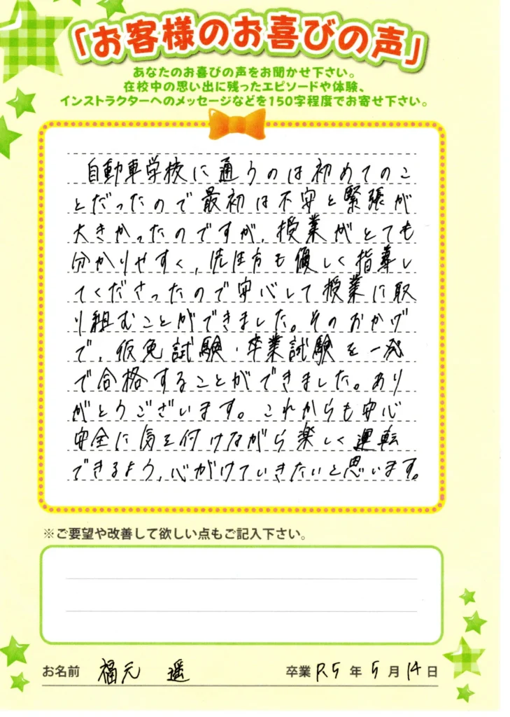 5月14日卒業の福元さまより喜びの声を頂きました!