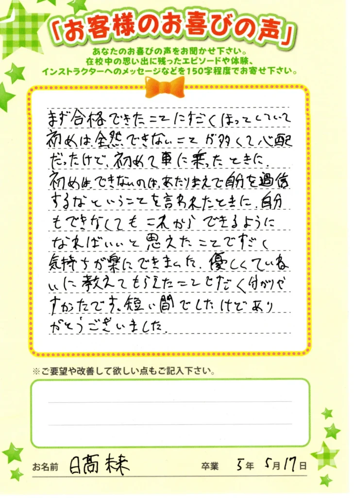 5月17日卒業の日髙さまより喜びの声を頂きました!