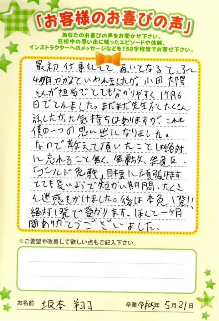 自動車学校お客様喜びの声を頂きました。