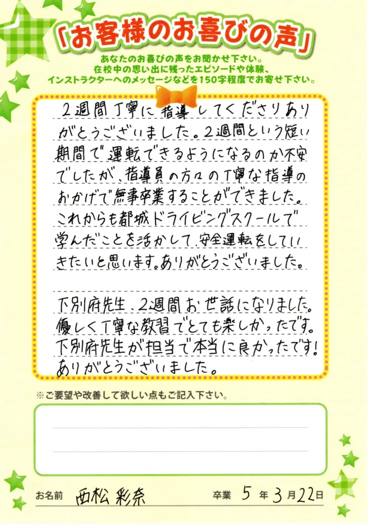 自動車学校お客様喜びの声を頂きました。