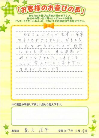 • 先生方のおかげで無事に卒業することができました。おもしろい先生が多かったので、教習はとても楽しく、車の運転が好きになりました。これからもここで学んだことを忘れずに生きていきたいです。