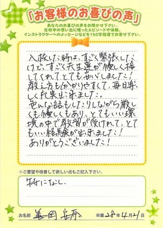 • 合宿で免許を取りに来ましたが、短い間で勉強するのはとても大変で卒業できるかどうか不安でした。でも、先生方が優しく分かりやすく指導して下さったので、無事合格することができました。  ありがとうございました。