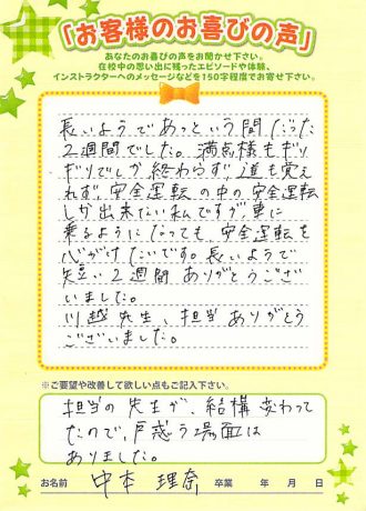 長いようであっという間だった2週間でした。満点様もギリギリでしか 終わらず道も覚えれず安全運転の中の安全運転しか出来ない私ですが、 車に乗るようになっても安全運転を心がけたいです。 長いようで短い2週間ありがとうございました。 川越先生、担当ありがとうございました。