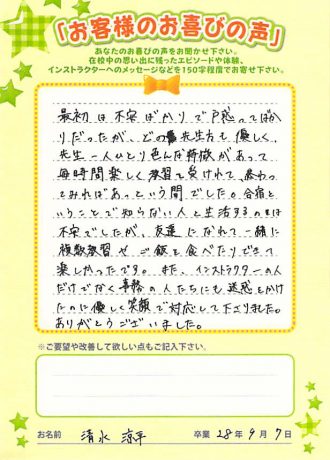 最初は不安ばかりで戸惑ってばかりだったが、どの先生も優しく先生一人ひとり 色んな特徴があって毎時間楽しく教習を受けれて終わってみれば あっという間でした。合宿ということで知らない人と生活するのは不安 でしたが友達になれて一緒に複数教習やご飯を食べたりできて 楽しかったです。また、インストラクターの人だけでなく事務の人たちにも 迷惑かけたのに優しく笑顔で対応して下さりました。 ありがとうございました。